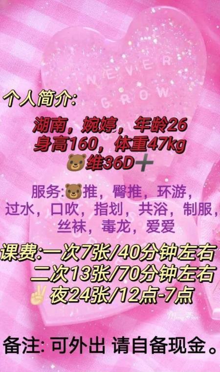 二刷婉婷,周末放假赶紧再约一下,到了地方给婉婷发信息开门,照片是她本人自拍。能毒龙,能69,言语交谈蛮亲切的,服务也很实在,毒龙钻舌头舔肛,顺势还来了波海底捞月,这个角度口活一般人真顶不住,赶紧戴套,一插到底,换了几个姿势最后后入没几下就射了,配合度挺高,帮她推荐推荐。
